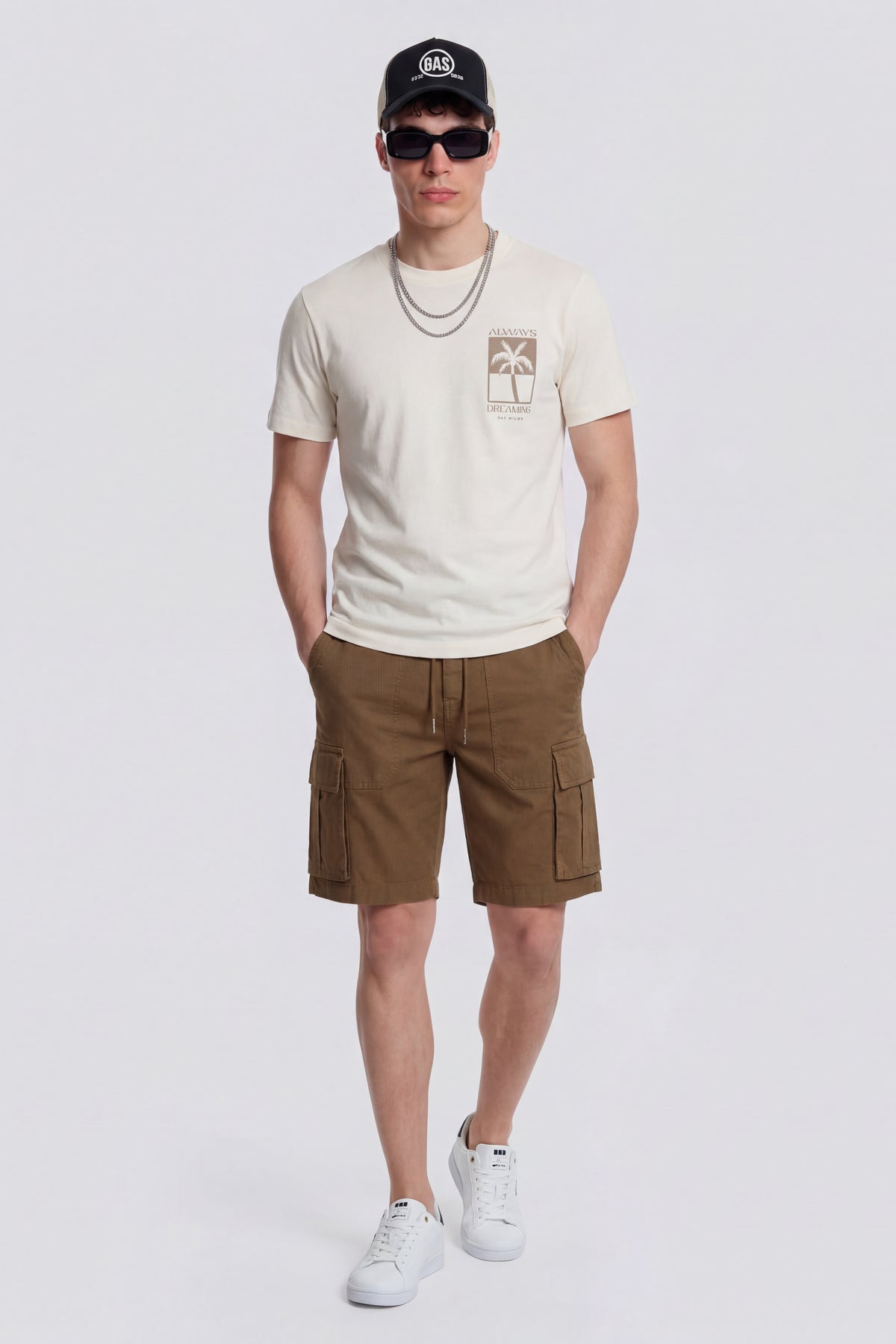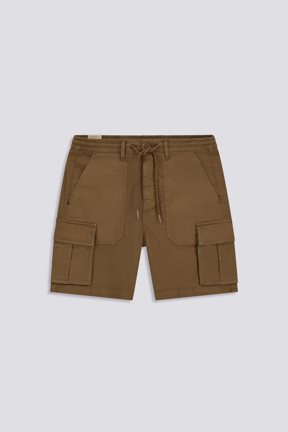 レギュラーフィットのメンズカーゴショーツ。ストレッチ性のある5.50オンス製品染めリップストップ生地を使用しています。ウエストのドローストリングとサイドのカーゴポケットがユーティリティデザインを強調し、快適で機能的な着用感を追求したモデルです。 主な特徴: