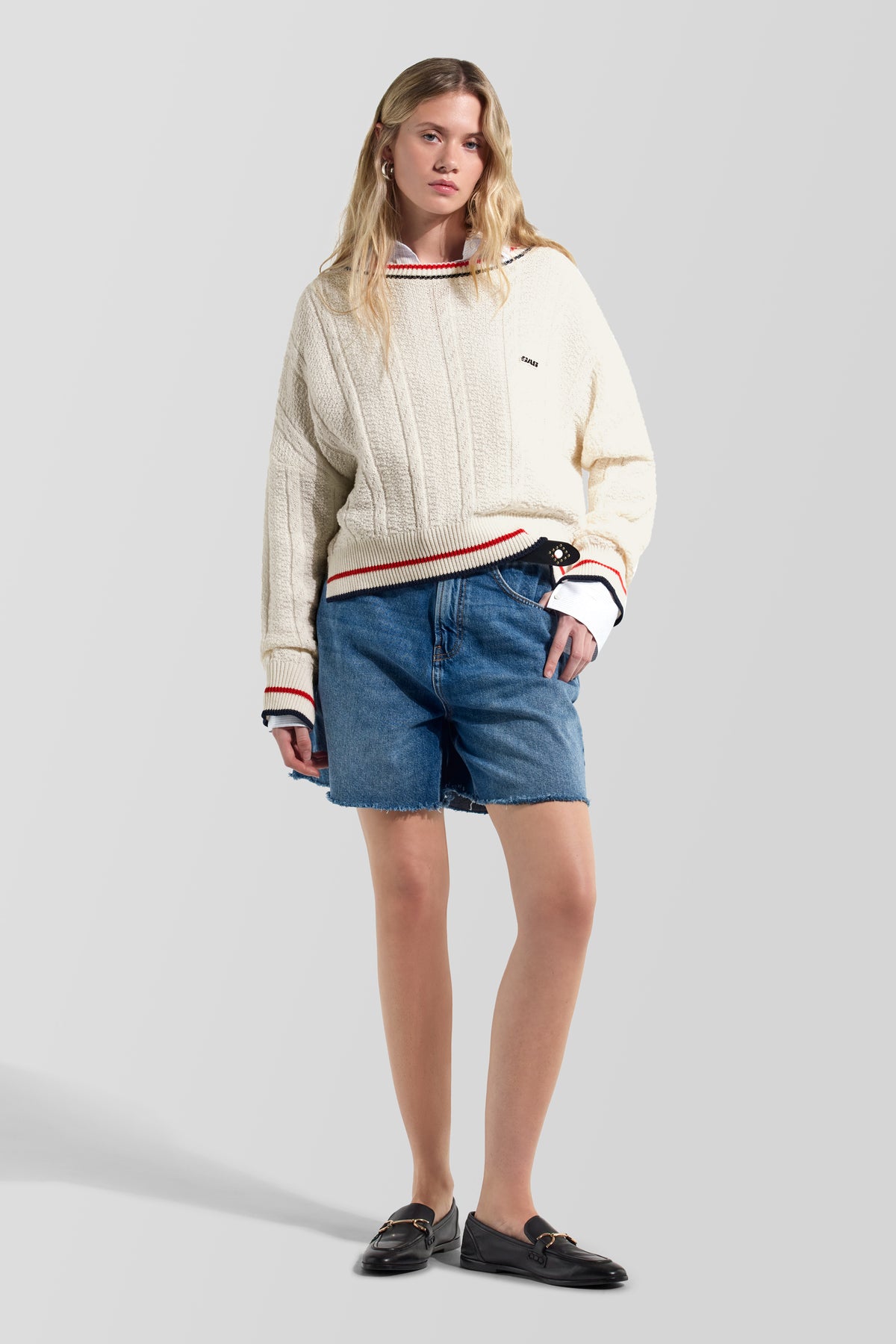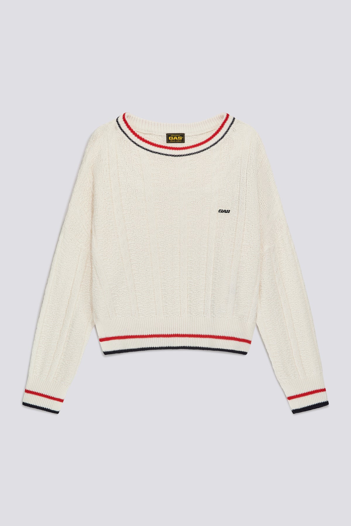 コットンとウールの糸を複数の編み目で仕上げた、女性用クルーネックオーバーフィットニットです。デザインはアーカイブのカレッジスタイルを彷彿とさせ、襟元、裾、袖口のコントラストラインがグラフィカルにボリューム感を際立たせます。立体的な編み地が深みを加え、リラックスしたフィット感が現代的なレイヤードに適しています。胸元のヘリテージパッチが、GASの歴史への本格的なアクセントとなっています。