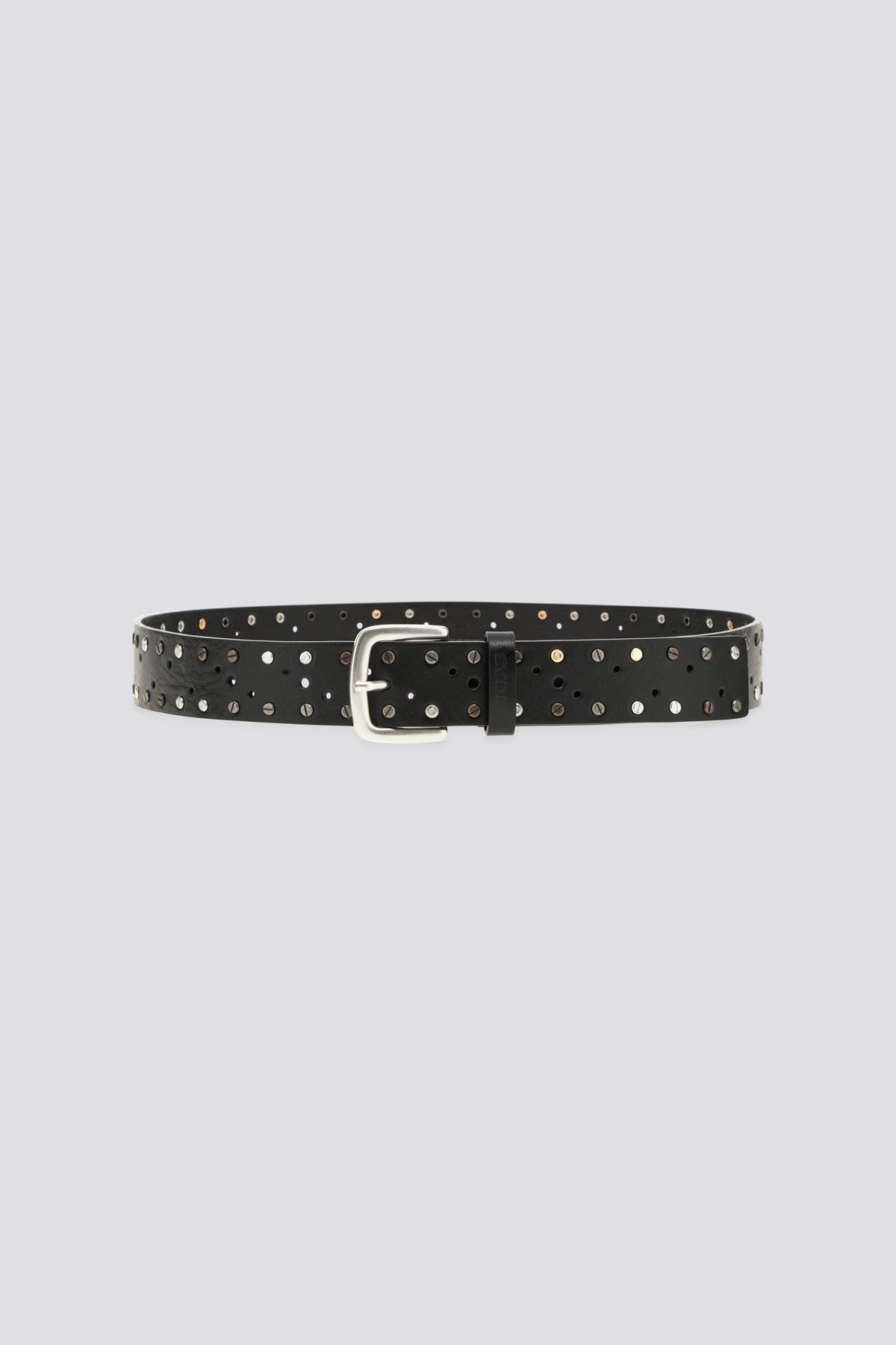 Cintura donna in pelle bovina con borchie all over, fibbia in metallo e passante personalizzato con logo impresso a fuoco. Un accessorio bold che aggiunge grinta a ogni look.