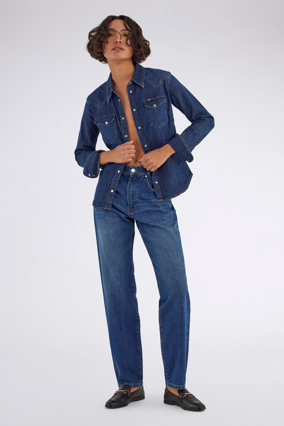 Camicia jeans donna slim fit in denim blue indaco stretch 6.75 oz. Il denim stretch accompagna la silhouette in un design clean e femminile, pensato per una donna sicura e contemporanea. Il lavaggio medio-scuro e i dettagli d’ispirazione denim heritage rendono il capo versatile, ideale per look urbani dall’attitude decisa.