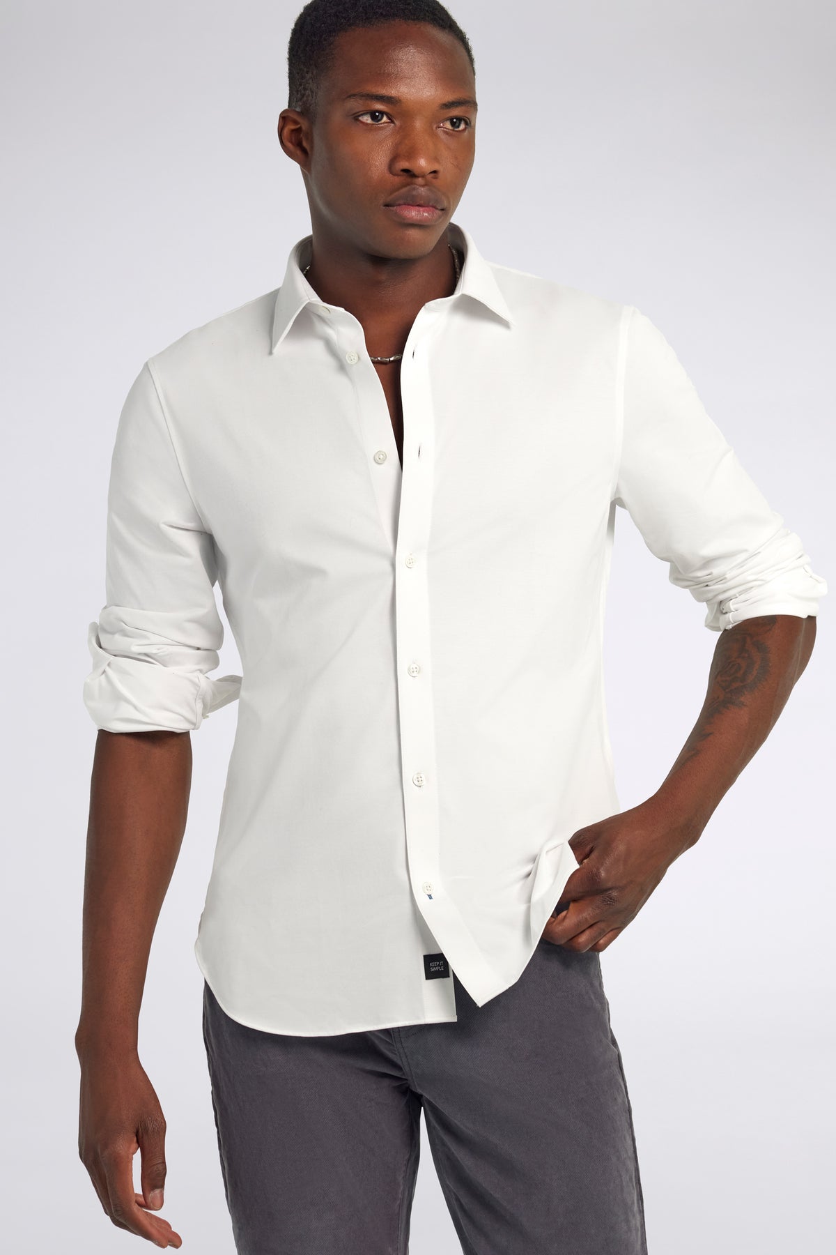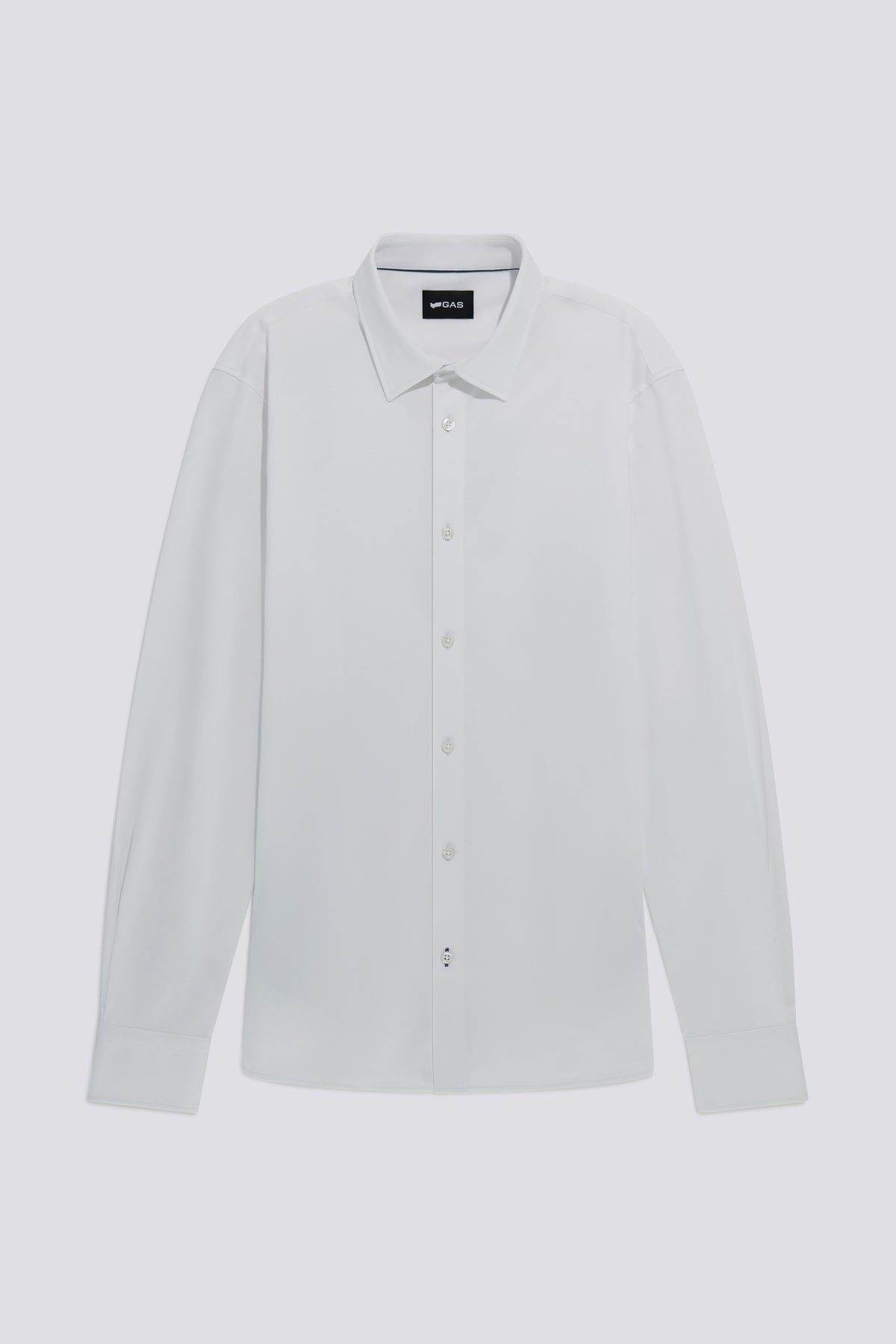 La camicia a manica lunga slim fit è realizzata in un confortevole misto cotone elasticizzato che garantisce libertà di movimento. Il ricamo iconico sul polsino aggiunge personalità a un capo essenziale, pensato per accompagnarti in ogni occasione, dal lavoro al tempo libero.