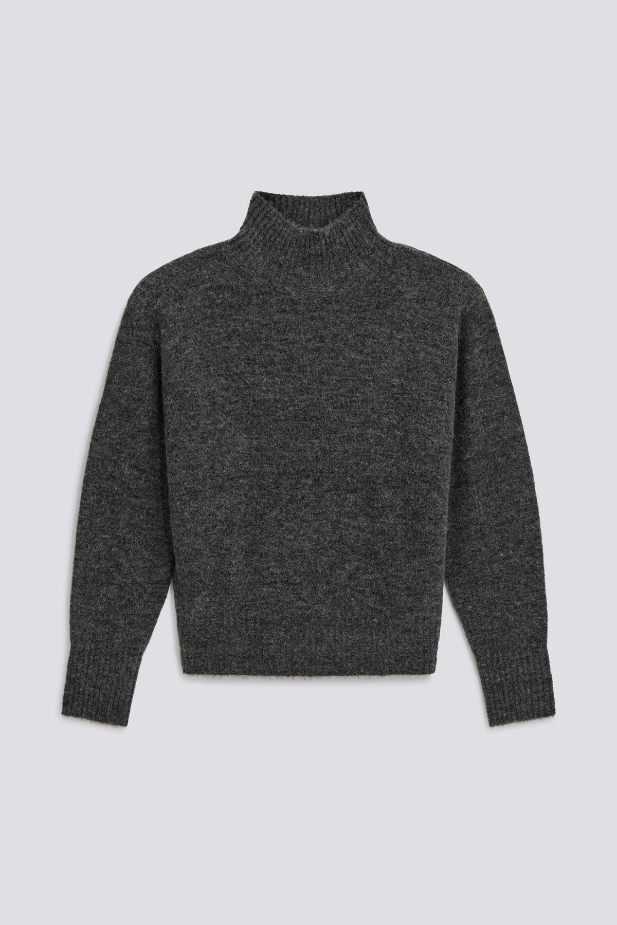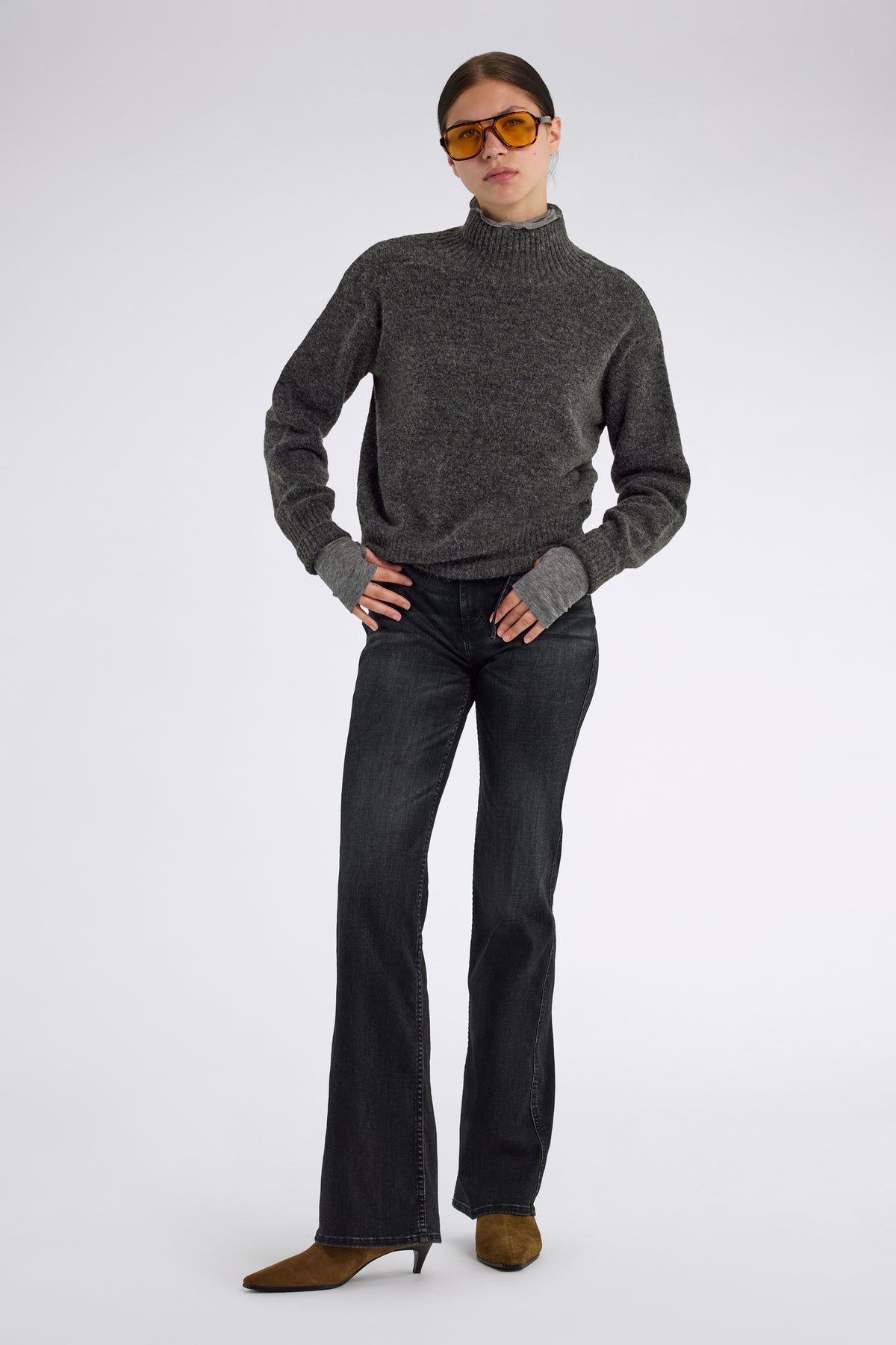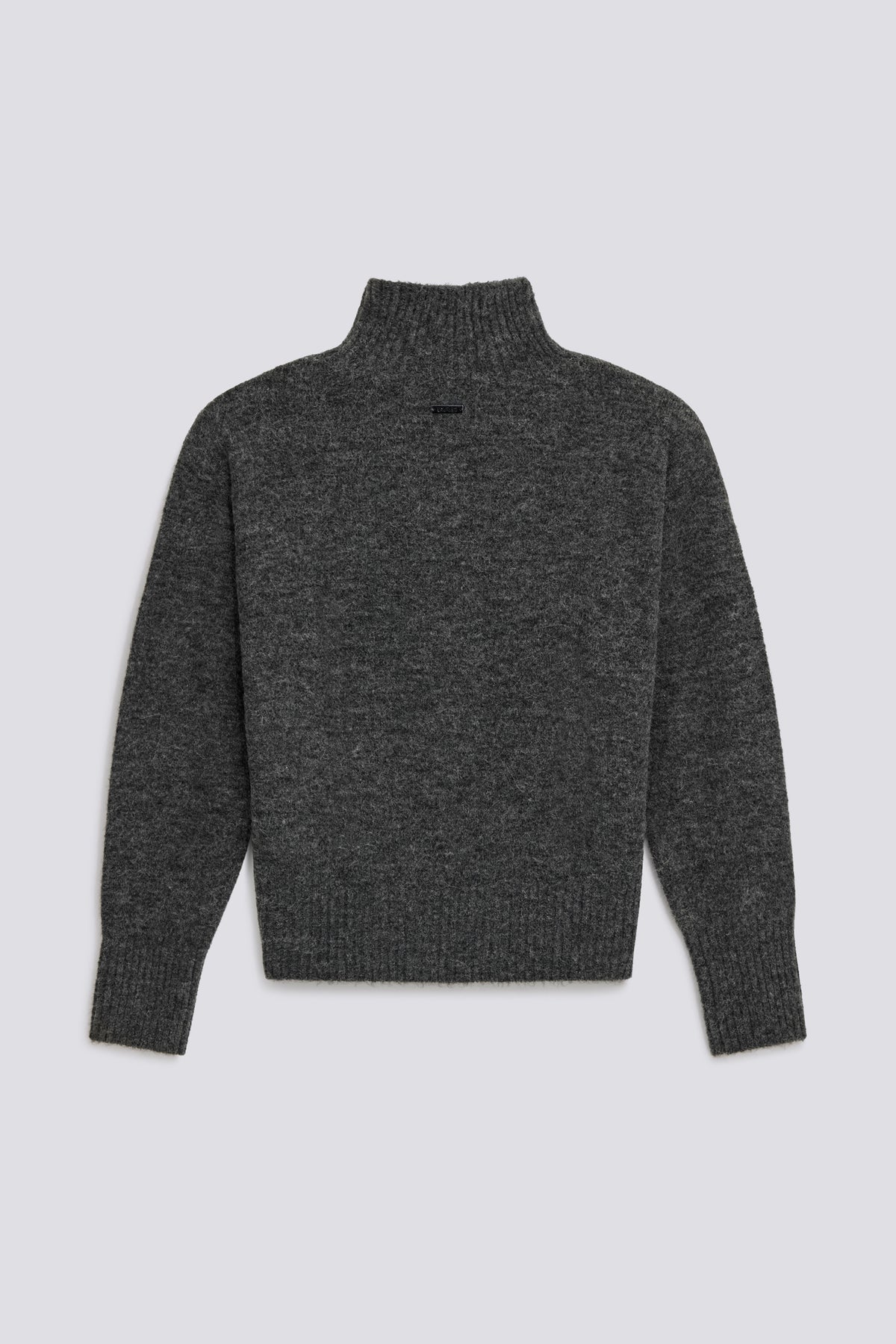 Maglia a collo alto dalla vestibilità regular, realizzata in un morbido filato misto con alpaca finezza 7. Il dettaglio della placchetta in metallo finitura canna di fucile sul fondo aggiunge una nota sofisticata e decisa. Perfetta da indossare con pantaloni flare per un look avvolgente e contemporaneo.