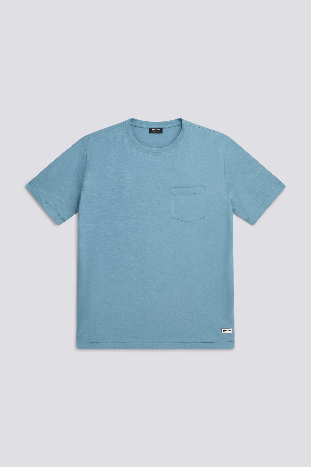 T-shirt a maniche corte regular fit in jersey slub di cotone, caratterizzata da una texture leggermente irregolare che aggiunge profondità al capo. Il taschino sul petto e le impunture a vista introducono un dettaglio funzionale, mentre il patch logo sul fondo completa il design.
